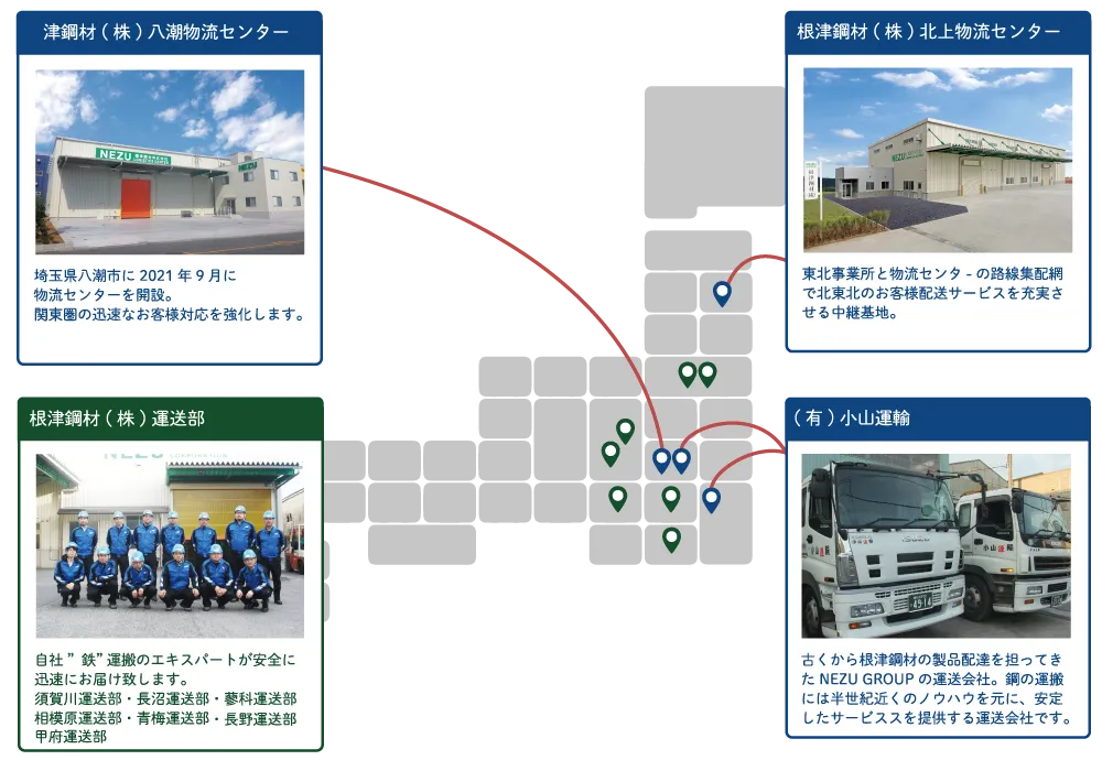 お客様が必要な商品・お客様が必要な時・お客様が必要な場所に納品をモットーにNEZUグループ ロジスティクスを運用しています。運送部門による集中管理により、より効率的にお客様の要望に合わせた配送運行を行います。